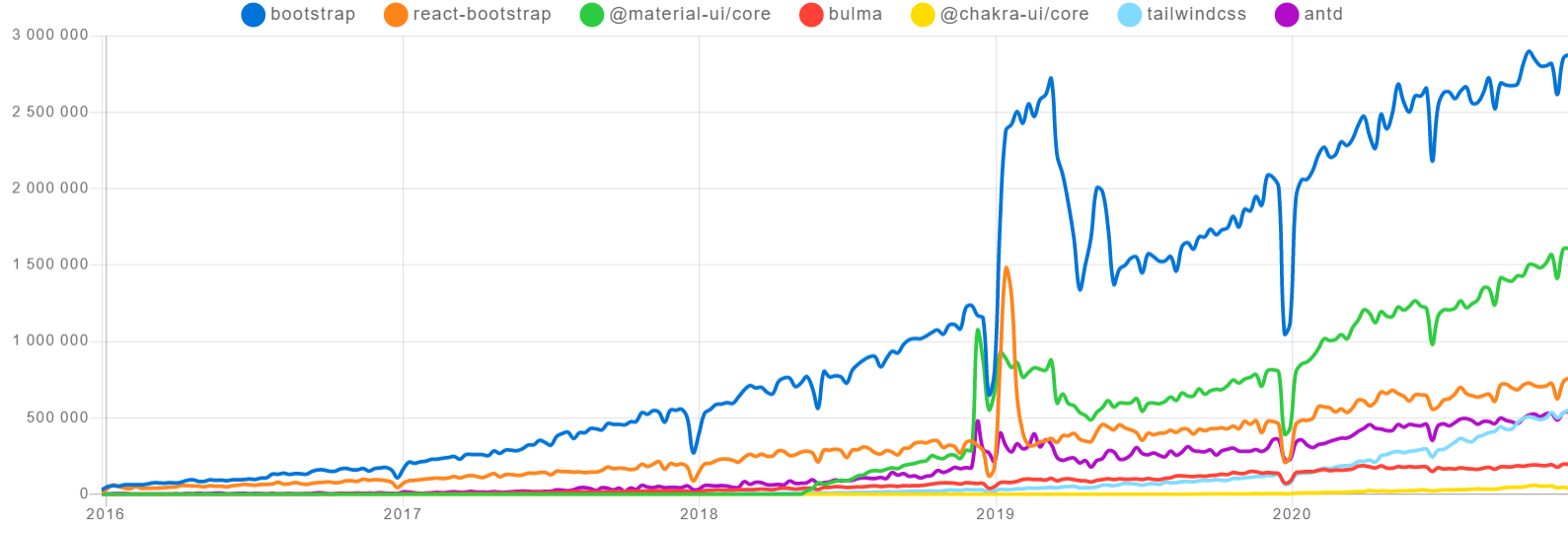 https://www.npmtrends.com/@emotion/core-vs-@emotion/react-vs-styled-components-vs-tailwindcss
