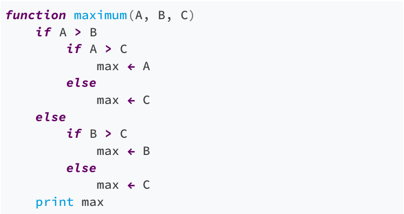 Cũng giống như flowcharts (từ nay anh sẽ viết biểu đồ luồng là flowcharts), mã giả cũng dùng để mô tả các tiến trình điện toán (computational process - computational là tính từ chỉ những gì liên quan đến điện toán máy tính). Ví dụ dưới đây là mô tả các bước tìm số lớn nhất trong ba số bằng mã giả: