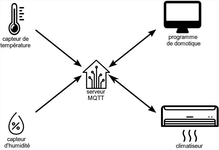 Le programme de domotique est abonné auprès du courtier MQTT pour recevoir toutes les messages aux sujets de la «température», de la «pression» et de l'«état du climatiseur». Le climatiseur est abonné auprès du serveur MQTT pour recevoir toutes les messages sur le thème «climatisation».