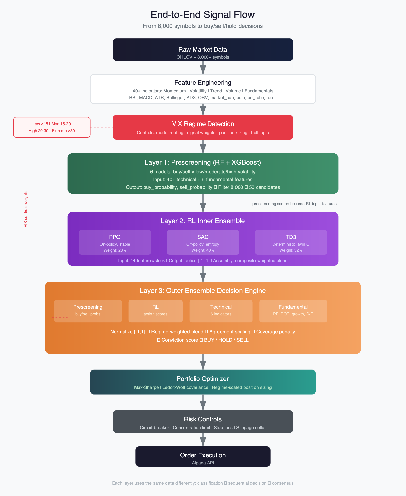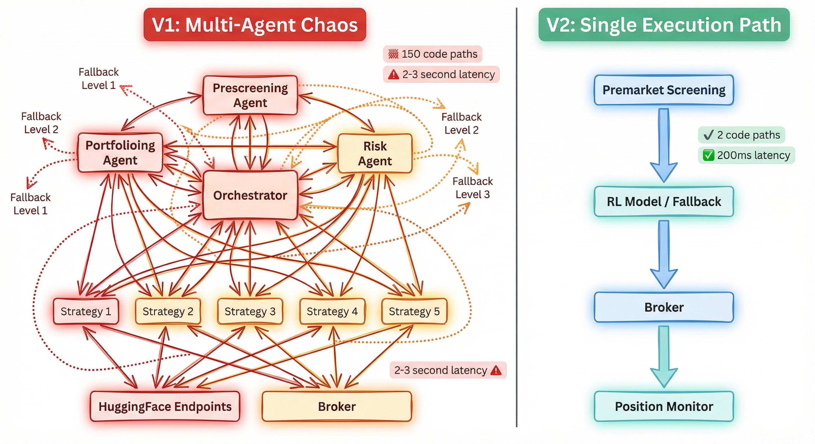 I spent weeks training a single PPO agent to make portfolio decisions. It worked well in calm markets. Then VIX spiked from 14 to 22 and the model froze — its learned policy didn't generalize to a volatility regime it hadn't trained in.