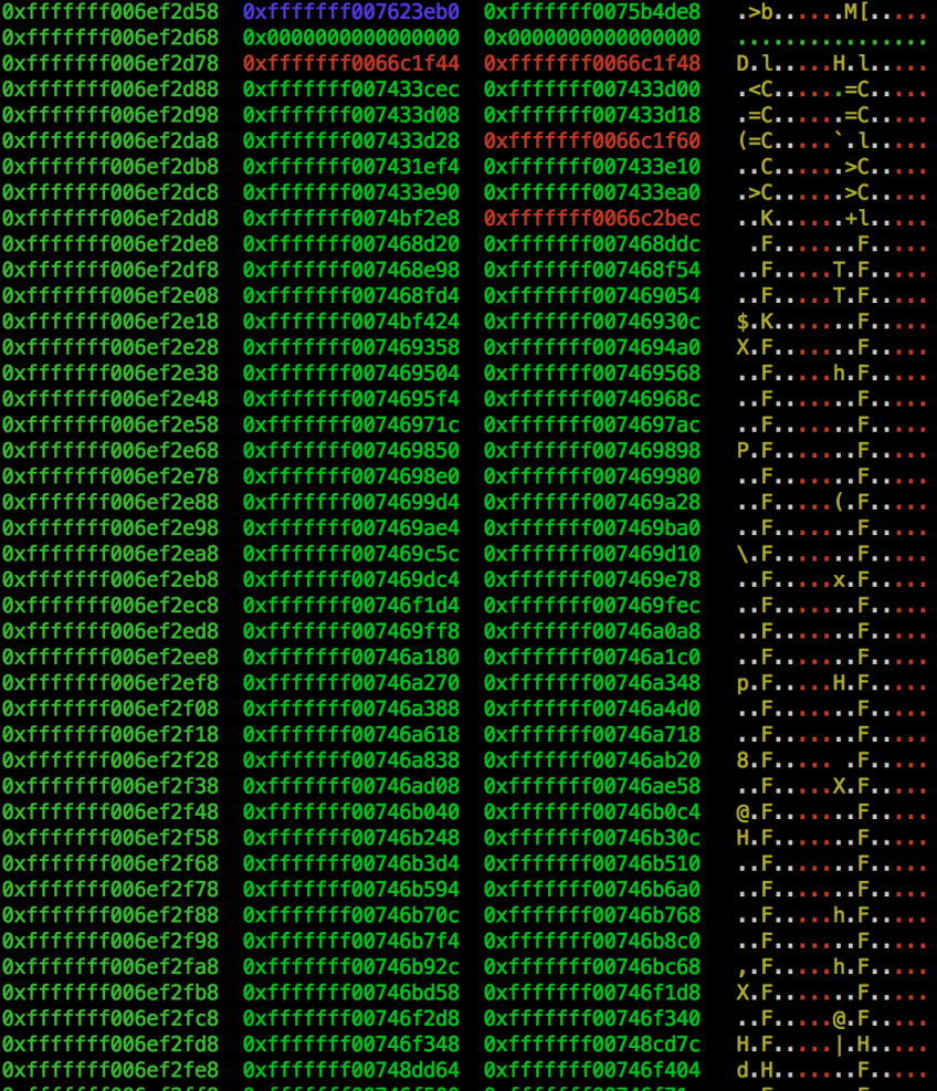 first 4 values being 0xfffffff0066b9098 0xfffffff0066b90ac 0xfffffff007433cec 0xfffffff007433d00