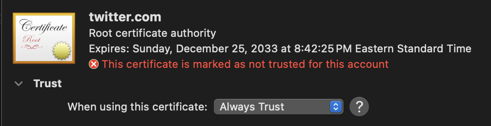 The target device will reject this as it doesn't recognize the certificate that is being presented by our nginx server for twitter.com (as it shouldn't). If you import the generated cacert.pem into your browser, however, then the browser will be able to see the presented certificate as trusted.