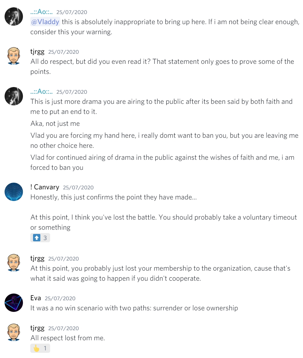 Around July 23rd, it all started when AoDude kicked Kyra for pinging him that his bot went offline. Thus, Kyra lost his Developer (and Admin) role, the former being given back once Kyra rejoined, however a reason behind the kick was never actually given. Around that day, we started drafting a formal letter, informing AoDude that due to his repeated violations of his own Code of Conduct, he will lose the ownership status on the GitHub organization, and unless he respects the terms mentioned in the letter, he'll lose the membership status as well.