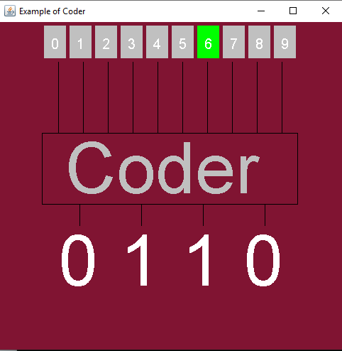 Создано демонстрационное приложение с графическим интерфейсом пользователя на основе разработанного/модифицированного лёгкого AWT-компонента и стандартных компонентов AWT. Данное приложение представляет из себя демонстрацию работы шифратора, где нажатие на кнопку имитирует подачу импульса на вход шифратора.