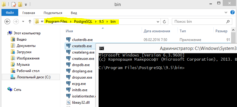 psql (PostgreSQL) 9.5.1Второй вариант: открыть каталог в проводнике, и в адресной строке ввести cmd:
