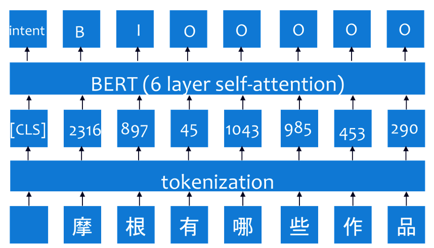 - Classify intention and extract slots: An intent classifier classifies logits of token [CLS] into a certain pre-defined intent. A slot classifier classifies each of the rest tokens in a BIO fashion. B signifies the start (boundary) of a slot, I represents that the token is still a part of (in) the previous slot, O means this token does not belong to (out) any slot. Each B label comes also with the type of the label, i.e. book, a film, a name.
