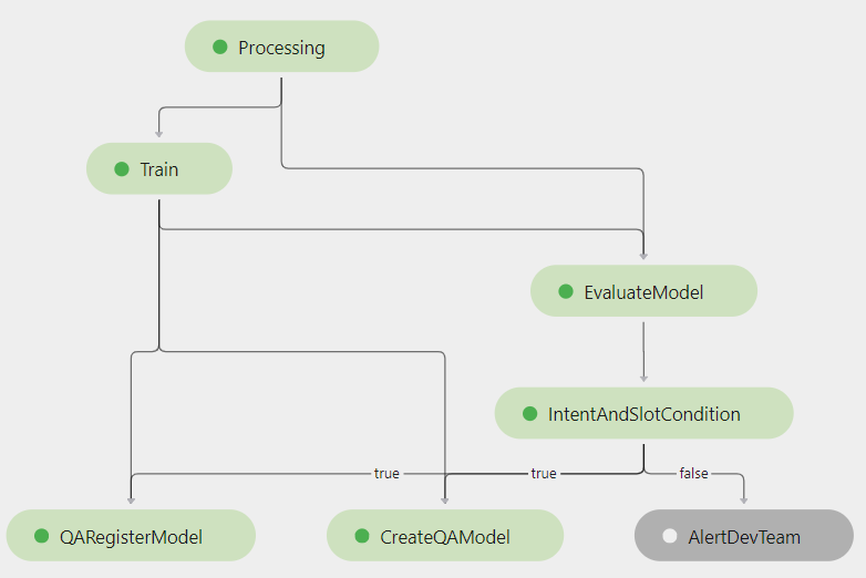 - F1Condition & AlertDevTeam - A condition step will then retrieve these metrics and compare them with predefined criteria. If the criteria are met, it will continue to register model, create model, etc.; if failed, it executes another set of actions -- in our case, it will alert the development team for further investigation.