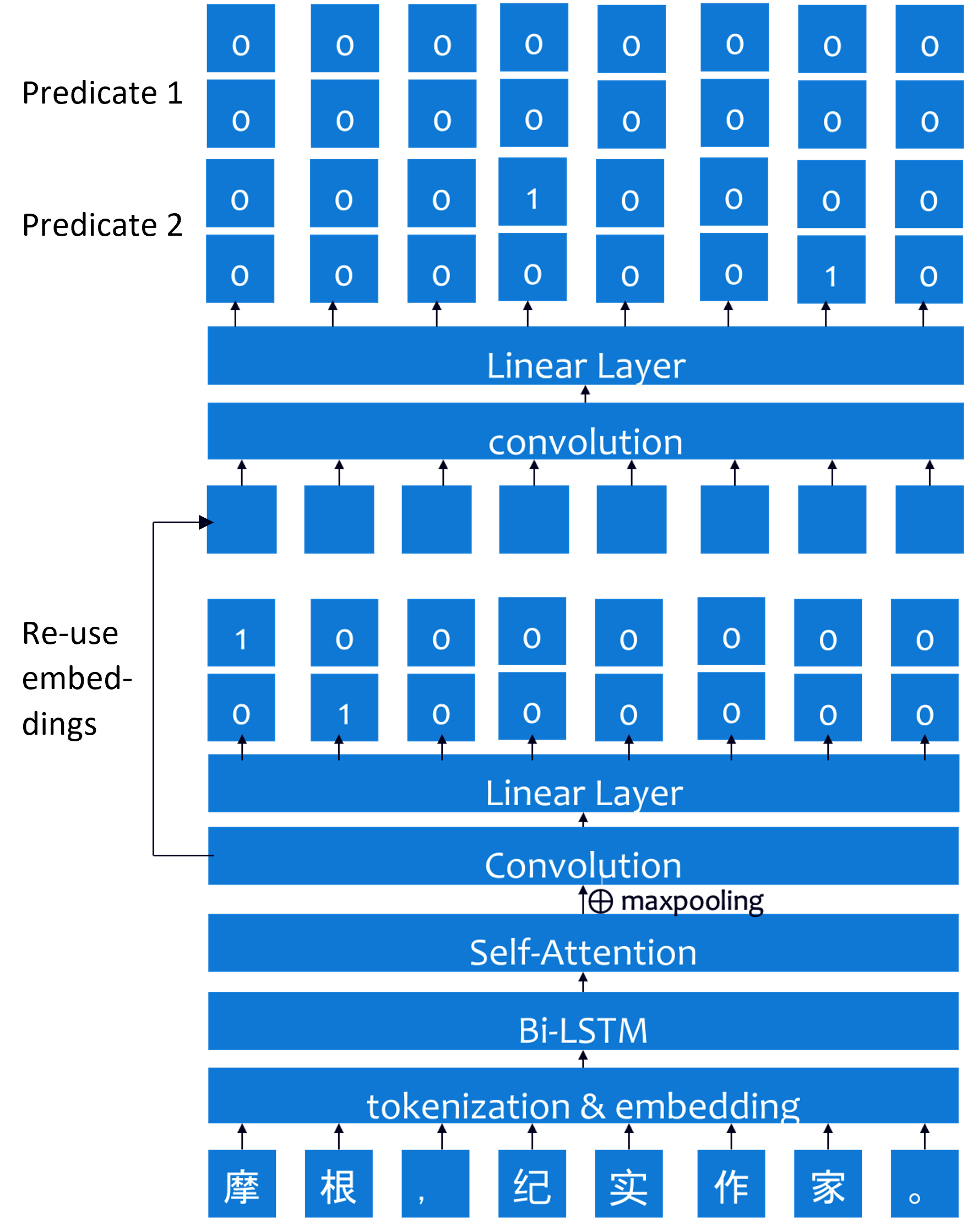 - Object prediction: The hidden states are then passed to a convolution layer and two linear layers to predict predicates and corresponding heads and tails of objects. The output size of the linear layer for each character is equivalent to the number of known predicates. This means, for each known predicate, we estimate possible pointers to the head and tail of objects according to the subject and the predicate.