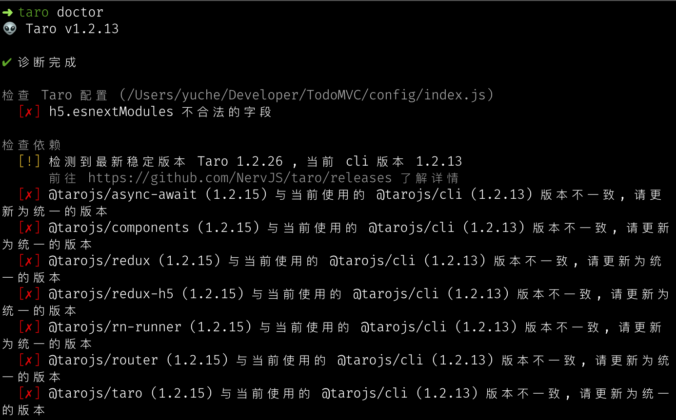 但和真正的医生不一样,Taro Doctor 不需要排队挂号,也不用花钱。你只需要在终端运行命令:taro doctor,就像图里一样: