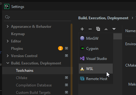 - Ouvrir les paramètres de CLion, aller dans "Build → Toolchains" et ajouter WSL