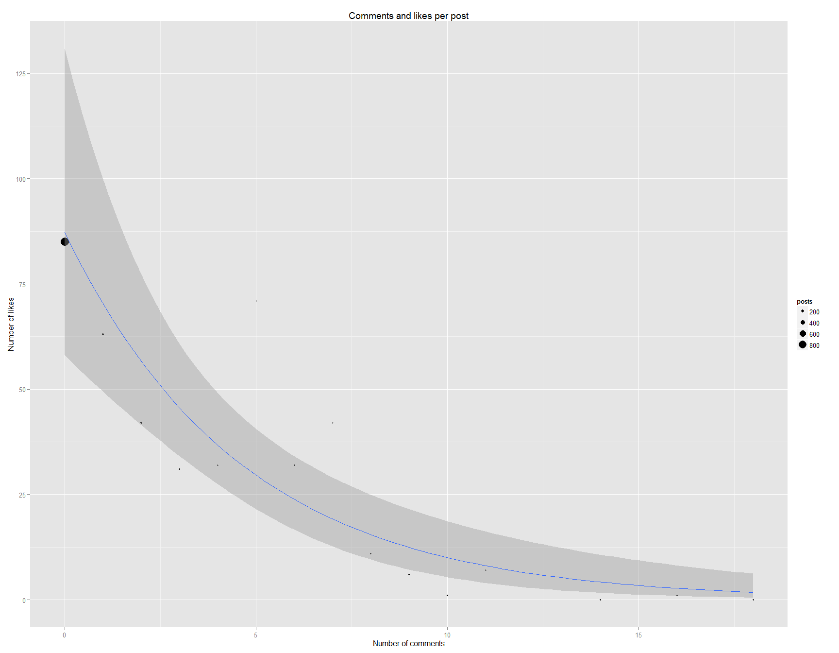 g1<-ggplot(data=fbPosts.group.comments,aes(x=comments.count,y=sumLikes))+geom_point(aes(size=posts))+geom_smooth(method="glm", family="quasipoisson")+xlab("Number of comments")+ylab("Number of likes")+ggtitle("Comments and likes per post")+scale_x_continuous(breaks=seq(0,50,5))+scale_y_continuous(breaks=seq(0,200,25))