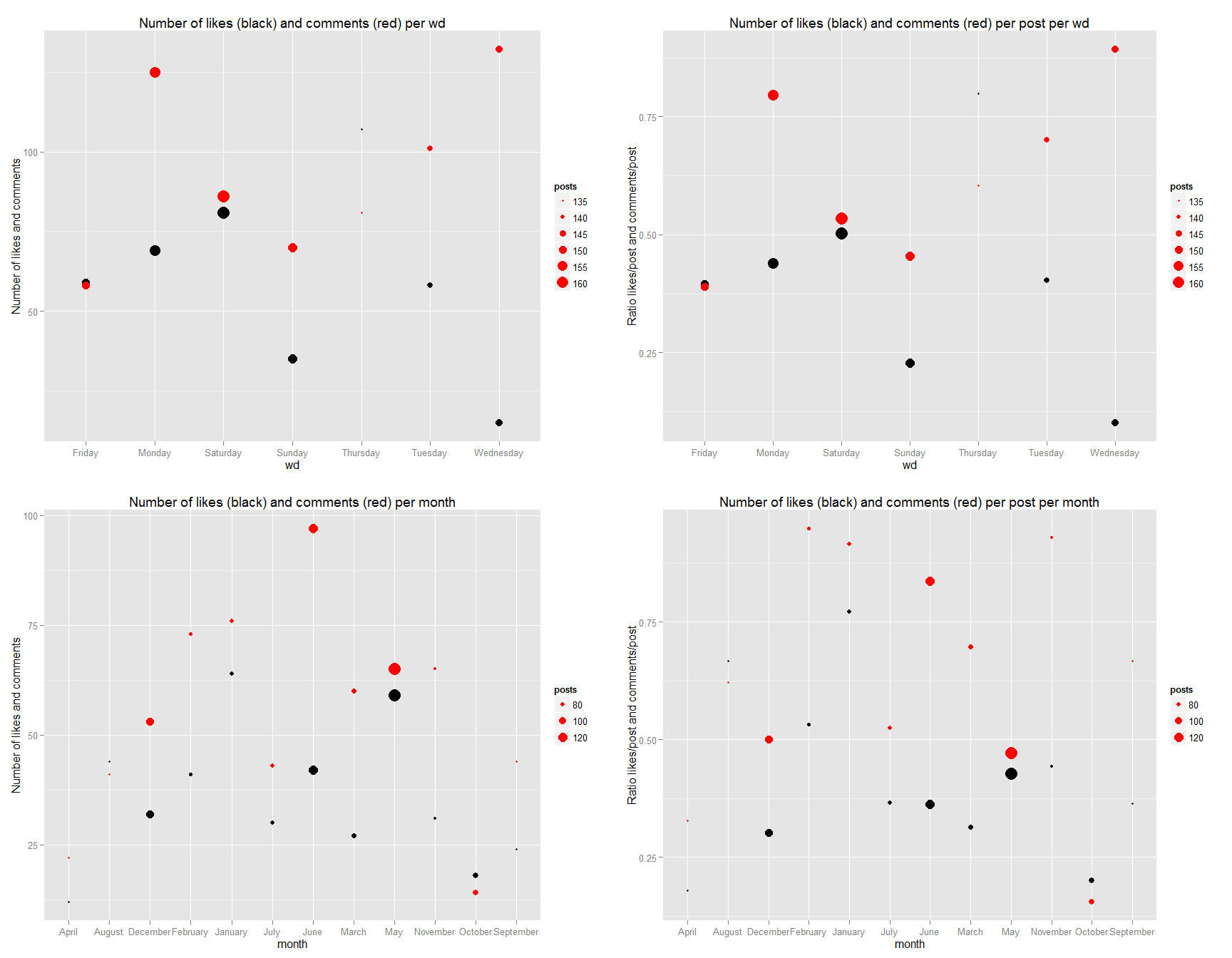 ggplot(data=ds,environment = environment())+geom_point(aes_string(size="posts",x=(xvar),y=("ratioL")))+geom_line(aes_string(x=(xvar),y="ratioL"))+geom_point(aes_string(x=(xvar),y="ratioC",size="posts"),color="red")+geom_line(aes_string(x=(xvar),y="ratioC"),color="red")+xlab(paste(xvar))+ylab("Ratio likes/post and comments/post")+ggtitle(paste("Number of likes (black) and comments (red) per post per",xvar))