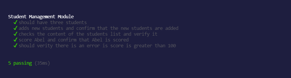 beforefunction, a new instance of theStudentManagementis created with three students and passed to thetestClassvariablebefore(() => { testClass = new StudentManagement(["Abel", "Ben", "Cain"]); });